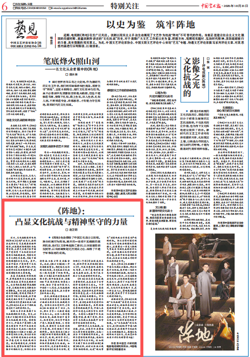 放眼新时代,《阵地》呈现的“文化抗战”具有更为深远的启示意义,新征程在历史智慧的照耀下更显光明。80多年前的文化抗战救亡运动,不仅是鼓舞民众、坚守精神和意志的成功实践,更是中华民族文化自信与精神自强的集中体现。从“文化抗战”到文化自信,是《阵地》给予中国人的深刻启示:在实现中华民族伟大复兴的新征程上,思想文化的阵地不容丢失,民族复兴伟业离不开文化的繁荣兴盛!