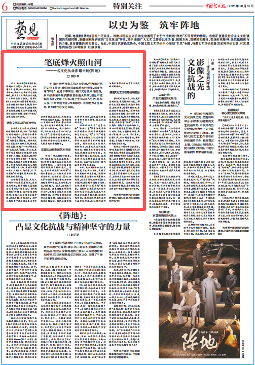 《阵地》于我而言,不仅是历史的回望,更是精神的洗礼。那些文化先贤的身影,他们手中的笔、案头的书,眉宇间的坚毅,在我脑海中愈发清晰。这部作品让我深刻领悟到:面对世界百年未有之大变局,作为新时代的文化工作者,我们同样面临着艰巨挑战,需要坚守“阵地”,立足本职岗位,履行文化使命与担当。虽不必像剧中先贤那般冒着炮火硝烟,但也不能躲进书斋,要向下扎根、向上生长,深入生活、扎根人民,不断精进专业、淬炼思想,才有能力守住阵地,筑牢时代的文化长城。